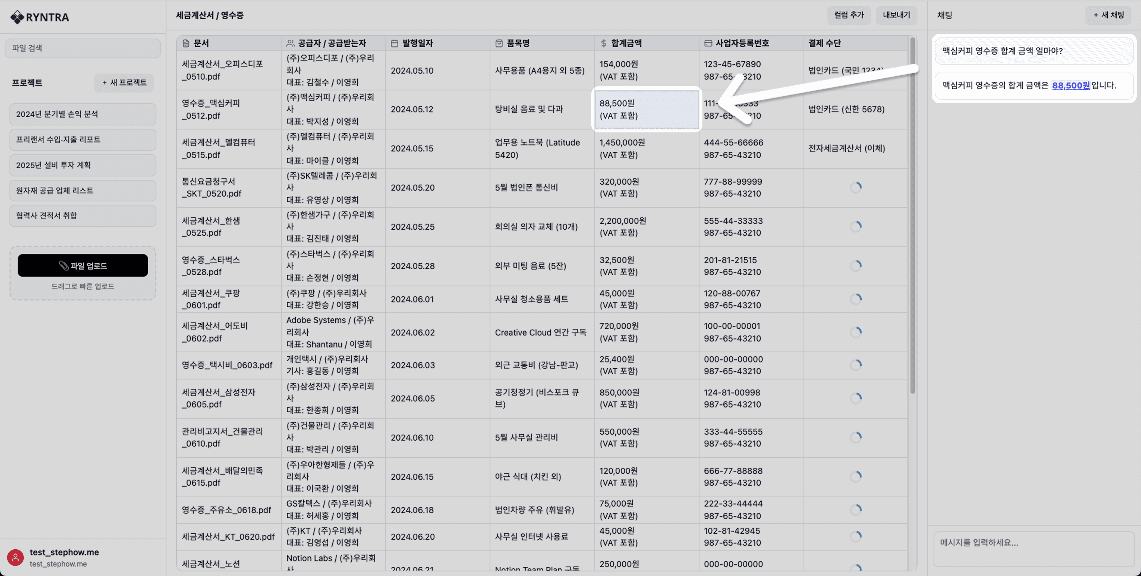 Ryntra가 문서에서 해당 값을 자동으로 찾아 표로 정리합니다.