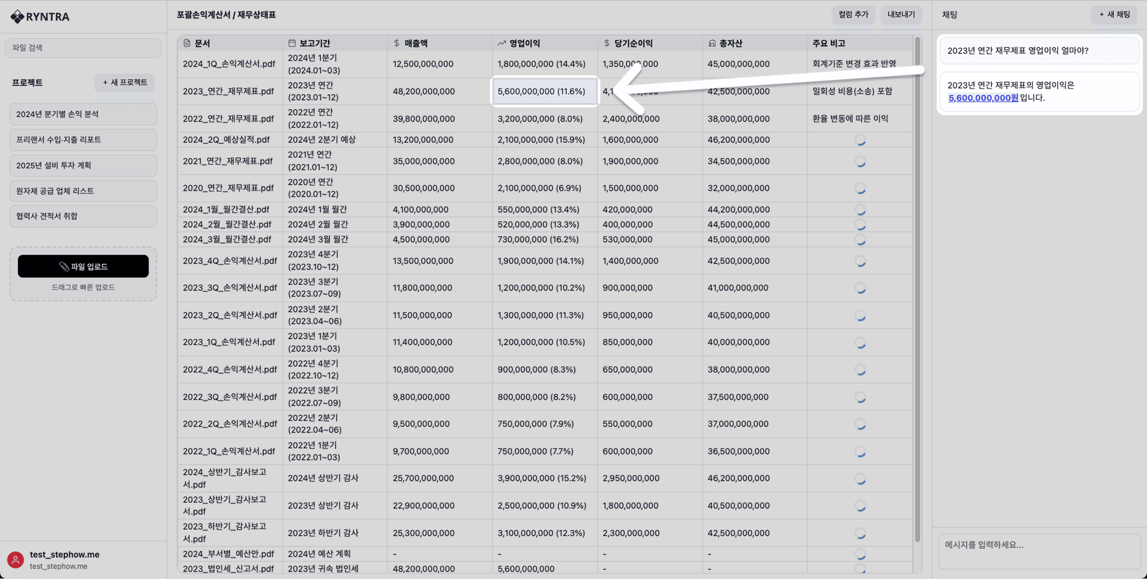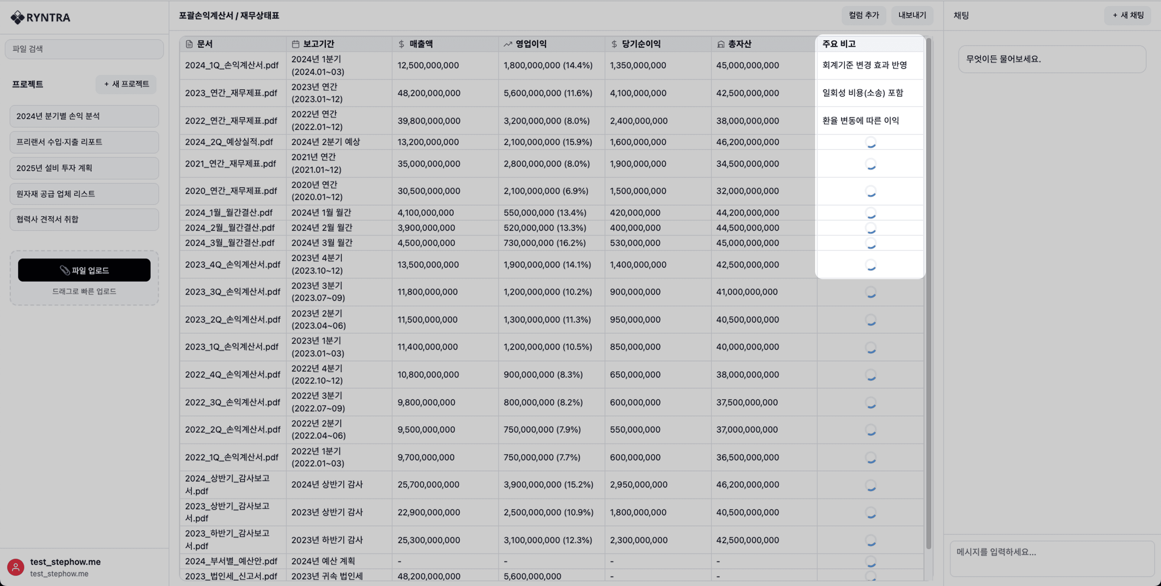 재무제표 등 문서를 업로드하면 추출–정리–분석이 자동으로 이어집니다.