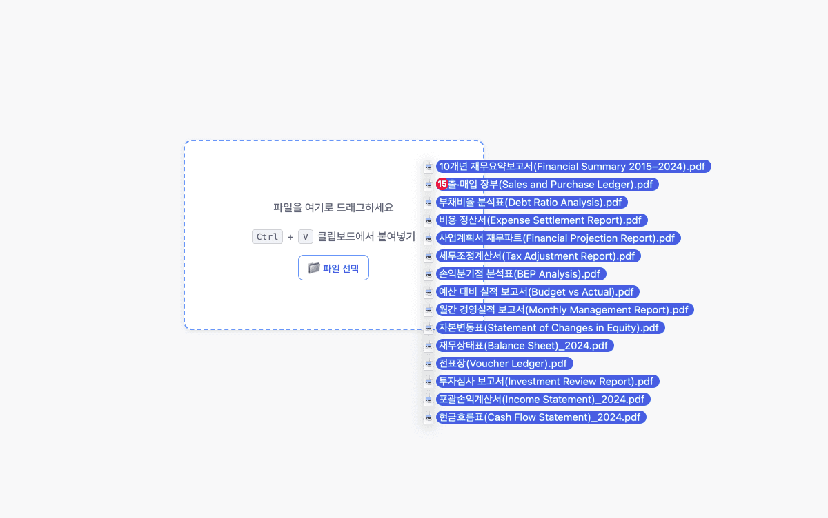 재무 관련 PDF·스캔 문서를 그대로 업로드할 수 있습니다.