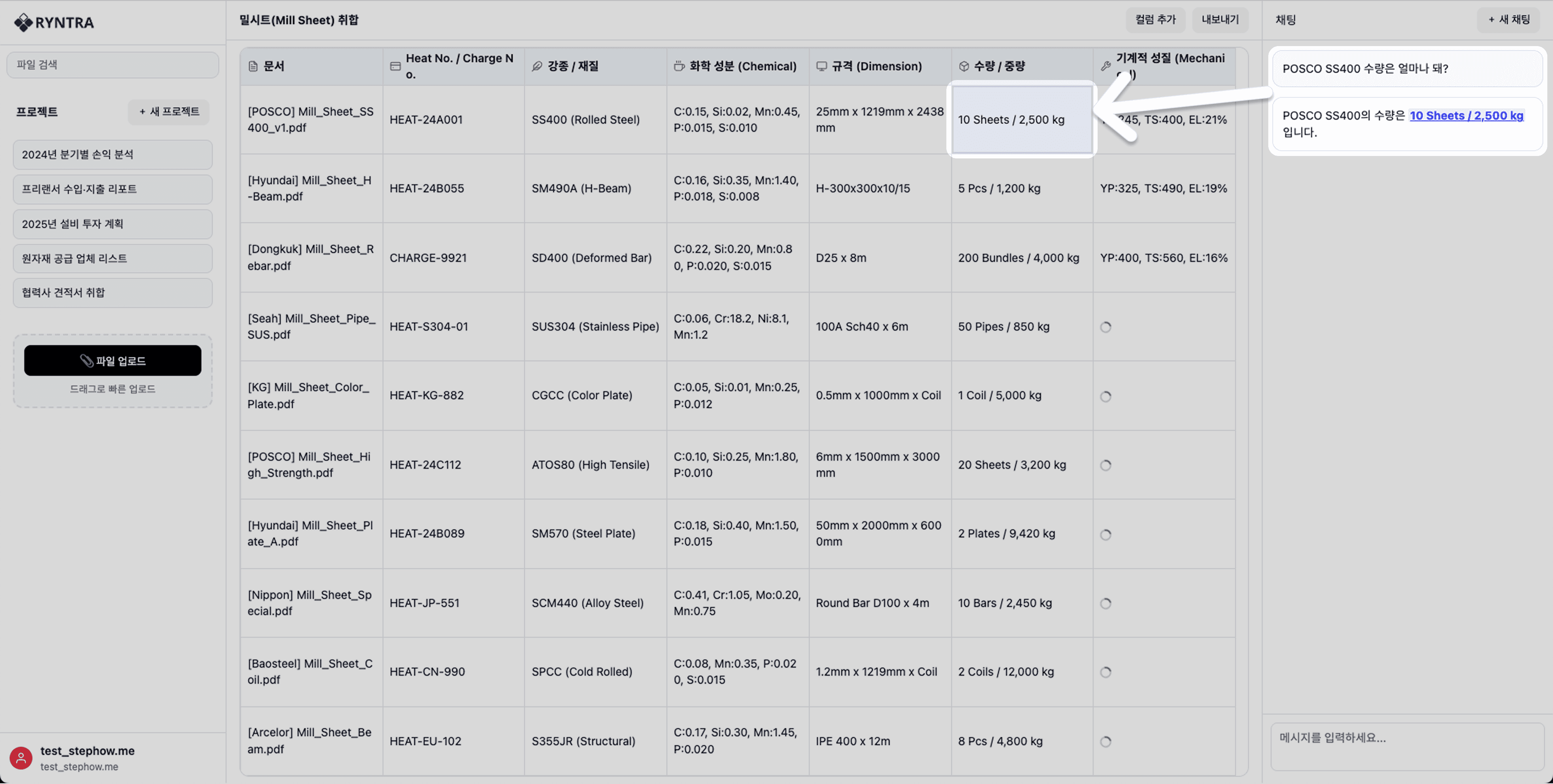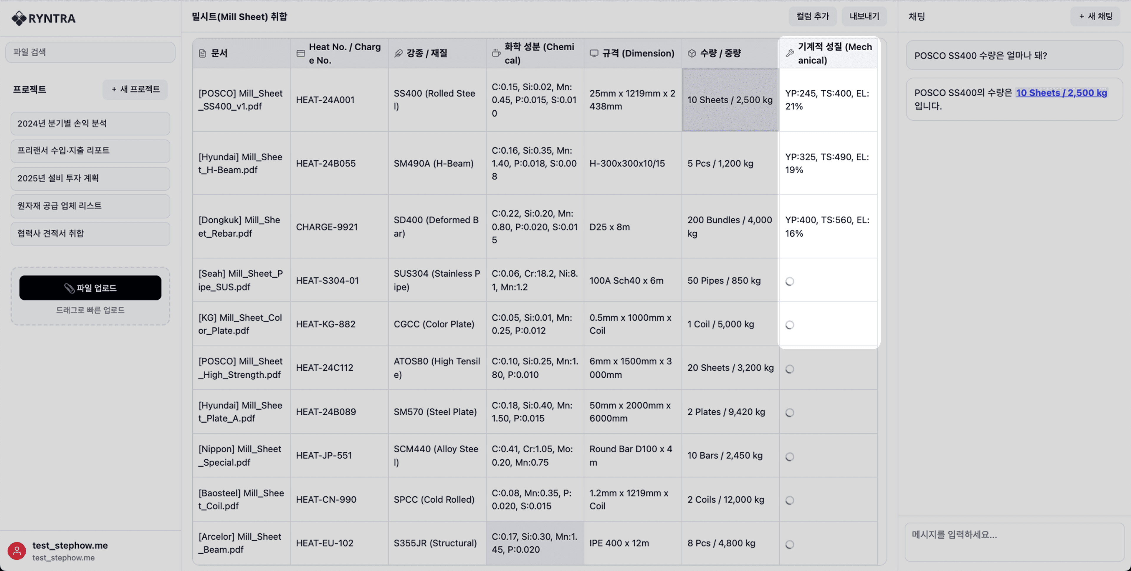 밀시트·시험성적서·납품 서류를 업로드하면, 추출·정리·분석까지 한 번에 이어집니다.